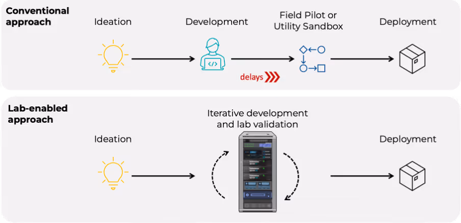 The typical route from concept to deployment in the power industry is long and often fragmented. Ideas move from development into pilot phases — usually within utility-controlled sandboxes — where testing is limited by scheduling, integration risk, and the availability of real-world assets. As shown in the diagram below, this conventional approach introduces delays and uncertainty at critical stages: