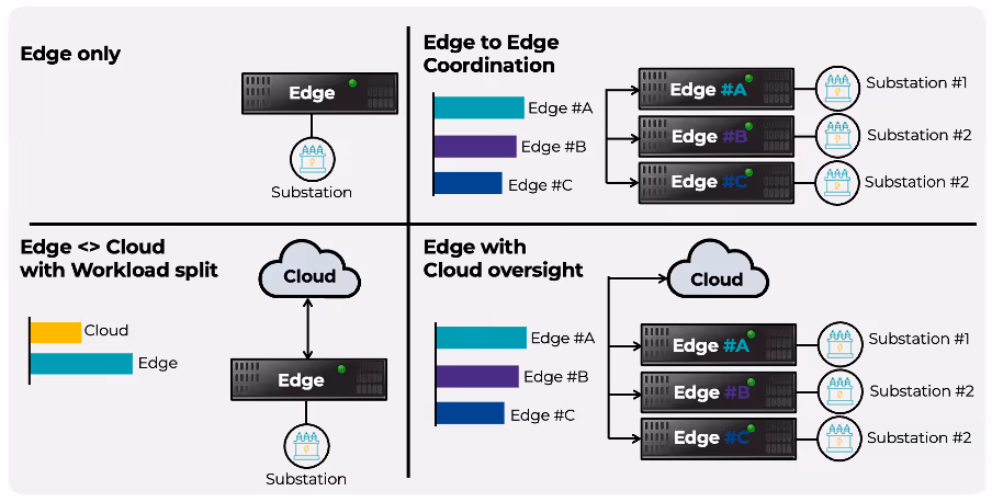 · Edge Only: Control and analytics are executed entirely at the substation. This configuration is ideal for latency-critical applications or locations with limited connectivity.