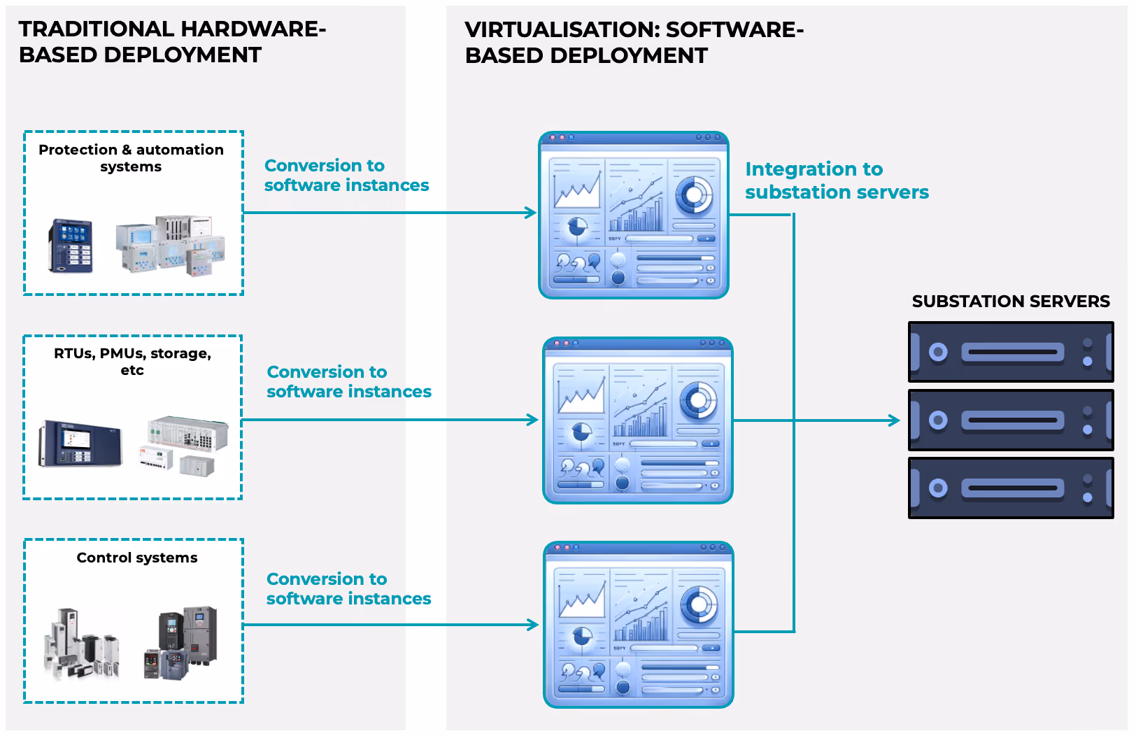 Virtualisation in power systems represents the transformation of traditionally hardware-bound functions—protection relays, controllers, RTUs,—into software instances running on shared, high-performance substation servers. As illustrated in Figure 1, this shift converts discrete, device-specific hardware into virtualised applications deployed on common computing infrastructure. Instead of installing new physical IEDs for every new functionality, utilities can now deploy software-defined protection, automation, analytics, and control applications as virtual machines (VMs) or containers. The physical footprint reduces, procurement cycles shorten, and functional expansion becomes a matter of software deployment rather than hardware integration.