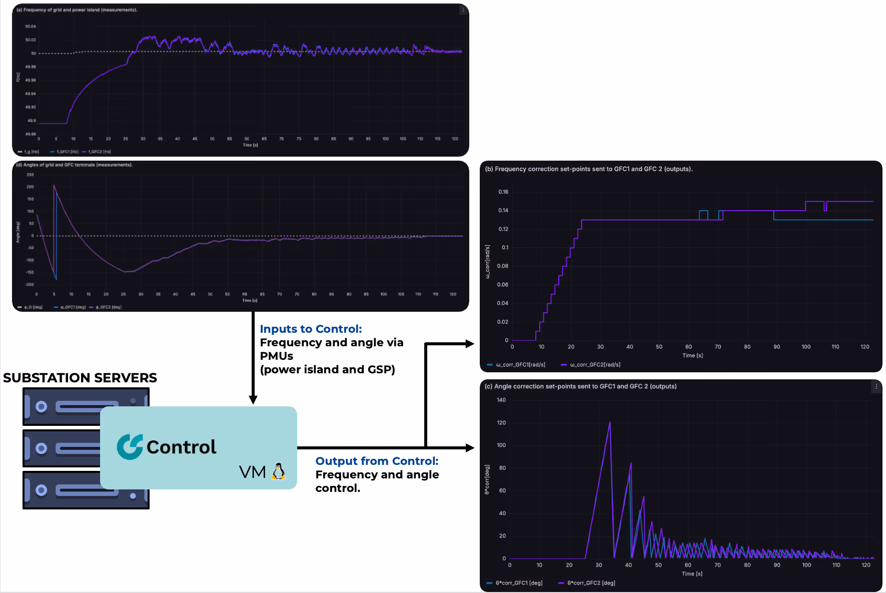 MV-Based Frequency and Angle Control for Power Island Operation and Re-Synchronisation: If voltage optimisation demonstrates closed-loop control, Figure 7 demonstrates something even more demanding: dynamic frequency and phase angle regulation during islanded operation and grid re-synchronisation. In this deployment, the Control VM operates directly on substation servers, interfacing with battery energy storage system (BESS) converters to regulate frequency deviations and manage phase angle alignment between a power island and the main grid.